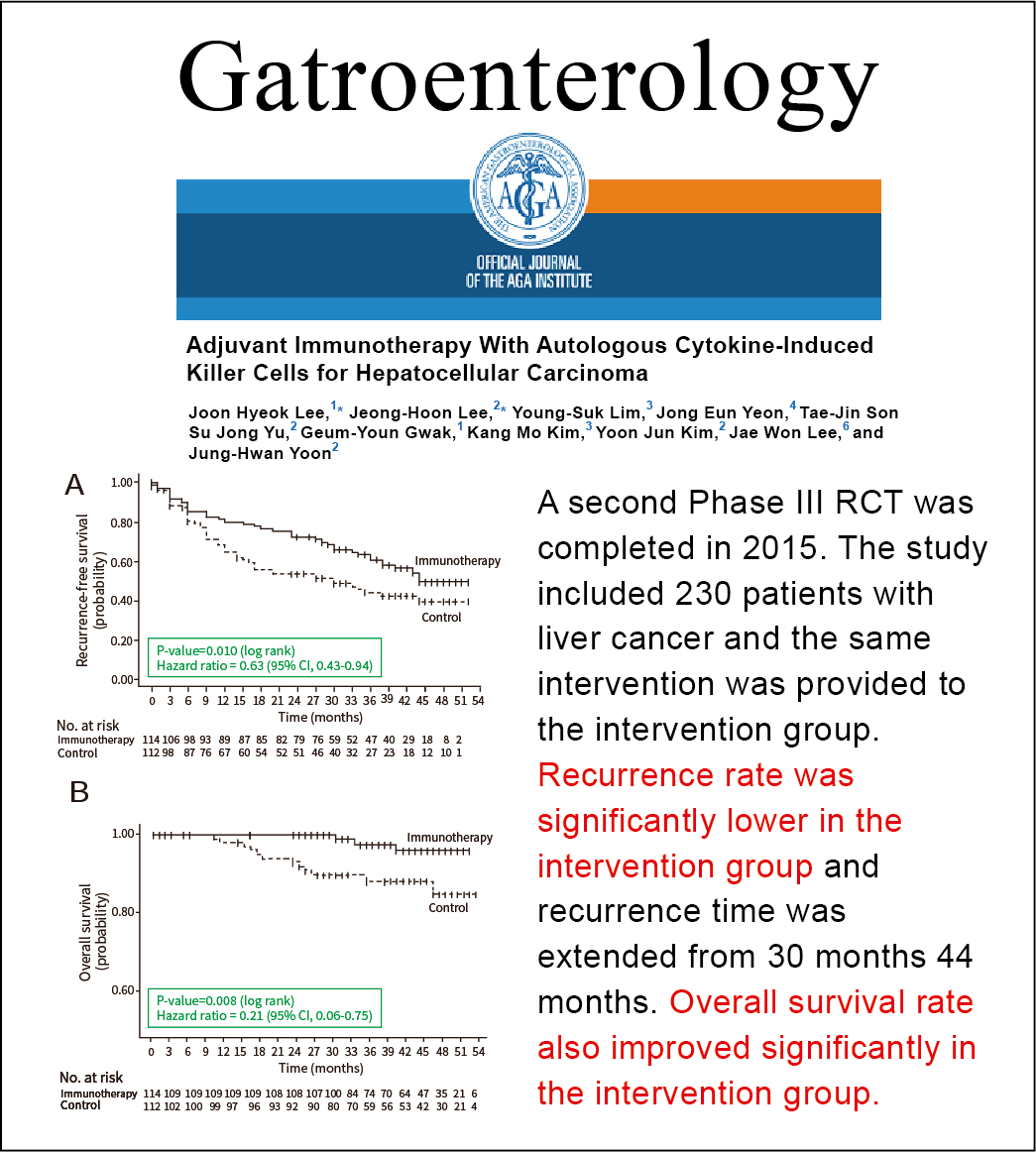 🔼The results of a Phase III clinical trial conducted by South Korea's GCC were published in the internationally renowned gastroenterology journal, Gastroenterology. The trial included 230 post-surgical liver cancer patients in stages I and II, who were randomly assigned to a treatment group receiving memory T cell therapy and a control group. After a 7-year follow-up, the recurrence-free survival rate in the treatment group was significantly higher than that in the control group (P=0.01). The overall survival rate in the treatment group was also superior to that in the control group (P=0.008). No severe side effects were found in the treatment group, with the main side effects being mild fever or local redness and swelling.